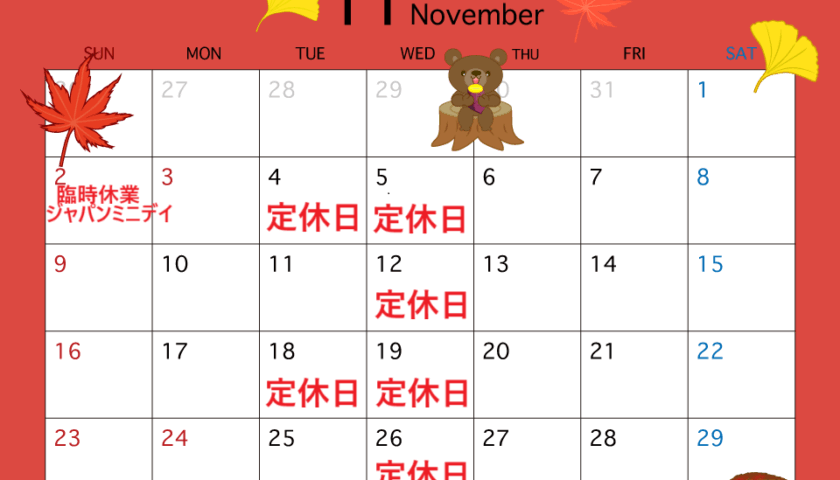 定休日の他に、2日(日)はジャパンミニデイ参加の為、臨時休業とさせて頂きます。